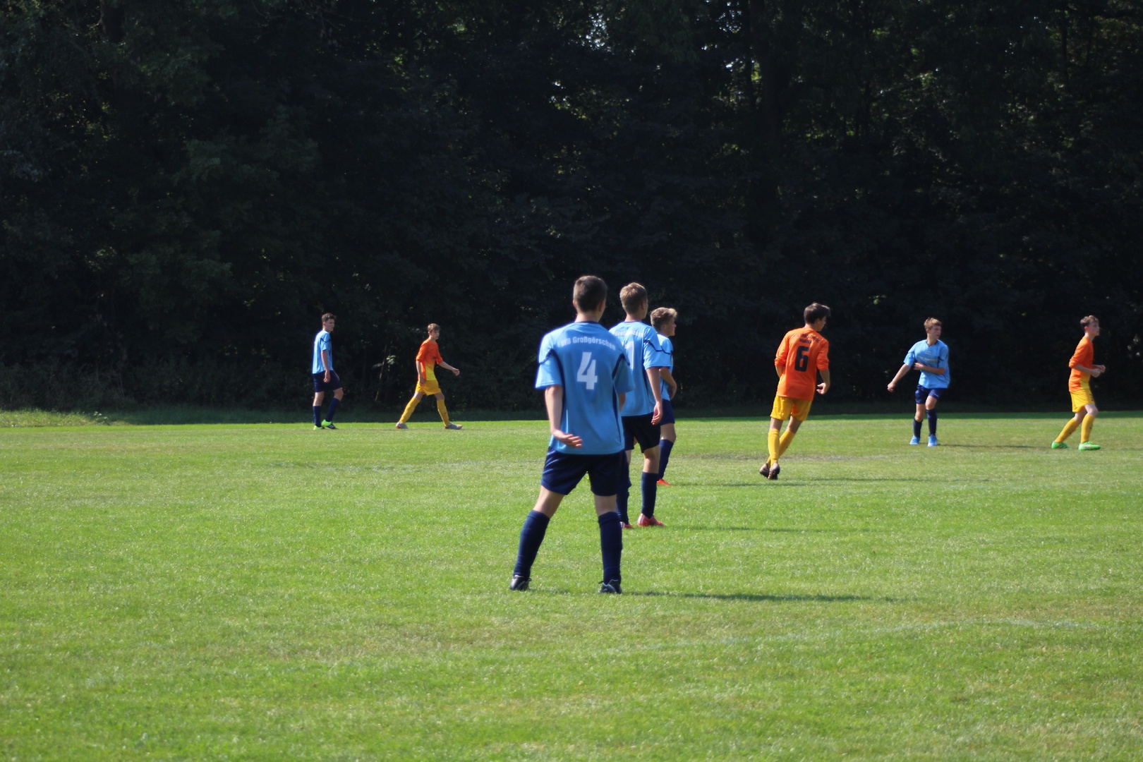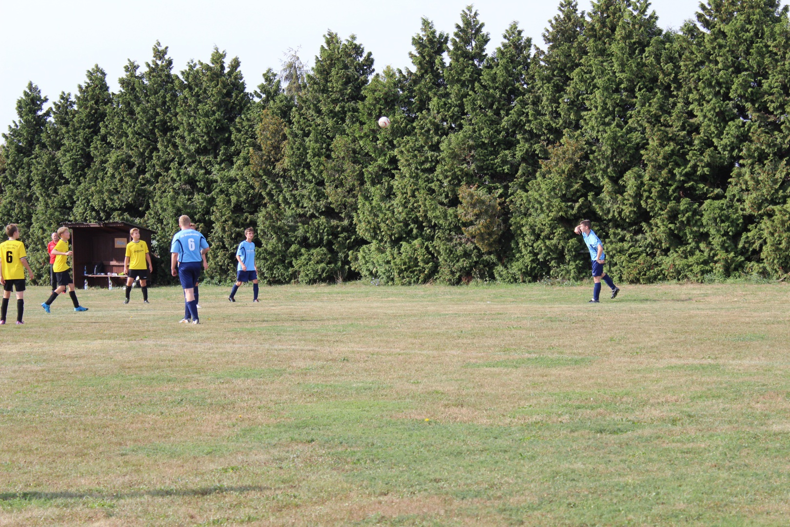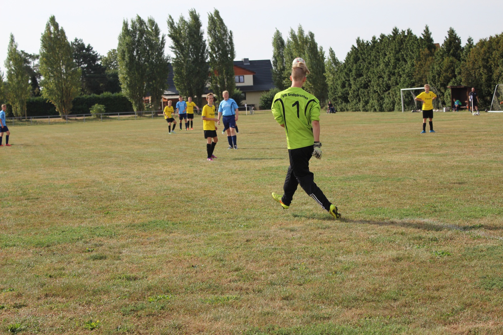 Heute war es nun soweit, wir hatten unser erstes Testspiel. Nachdem wir im Juli 2mal ein Kennlerntraining und letzten Dienstag das erste Mal Training absolvierten, ging es nun zum ersten Testspiel. Für die Großlehnaer Spieler unserer Mannschaft war es ein Heimspiel. Wir wussten dass unsere Gegner viel mehr Erfahrung hatten als wir, trotzdem hofften wir durch unsere jugendliche Unbekümmertheit und gute Kondition dies ausgleichen zu können. Wir einigten und darauf 3 x 30 Minuten zu spielen.