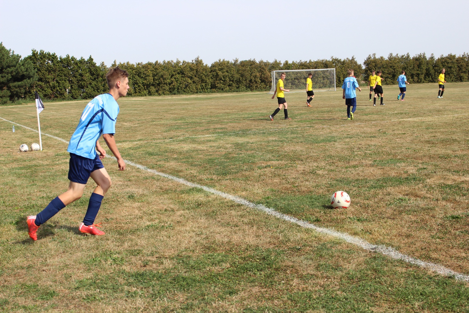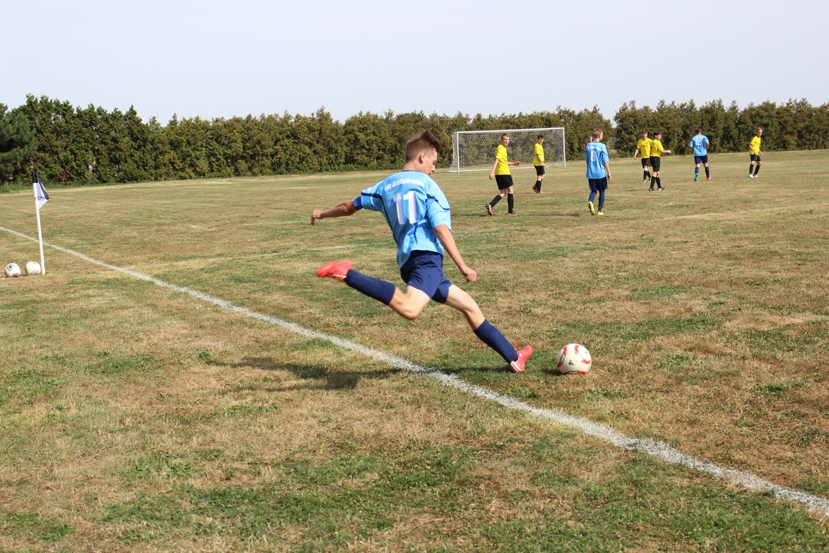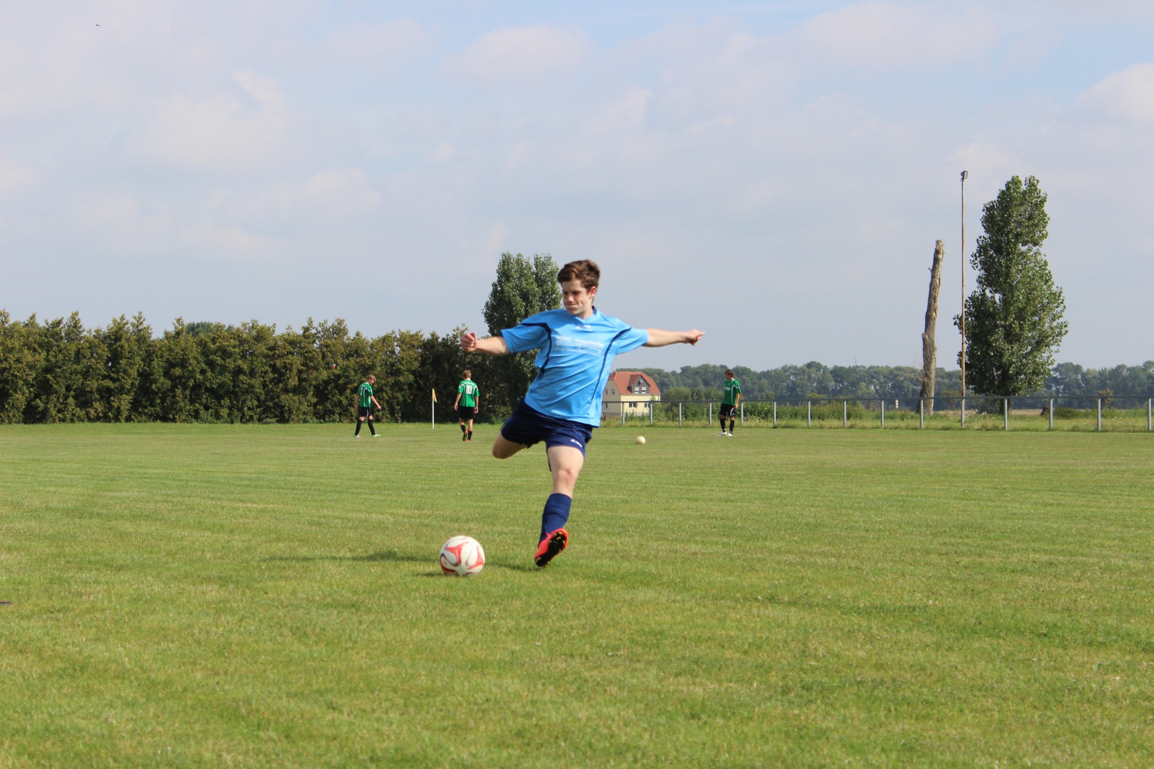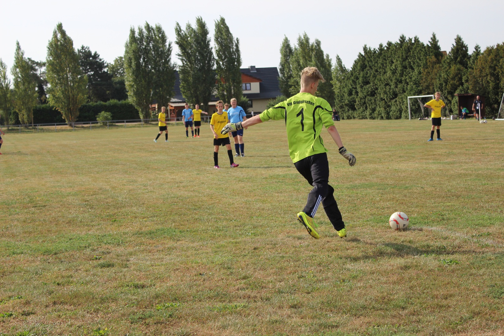 Heute war es nun soweit, wir hatten unser erstes Testspiel. Nachdem wir im Juli 2mal ein Kennlerntraining und letzten Dienstag das erste Mal Training absolvierten, ging es nun zum ersten Testspiel. Für die Großlehnaer Spieler unserer Mannschaft war es ein Heimspiel. Wir wussten dass unsere Gegner viel mehr Erfahrung hatten als wir, trotzdem hofften wir durch unsere jugendliche Unbekümmertheit und gute Kondition dies ausgleichen zu können. Wir einigten und darauf 3 x 30 Minuten zu spielen.