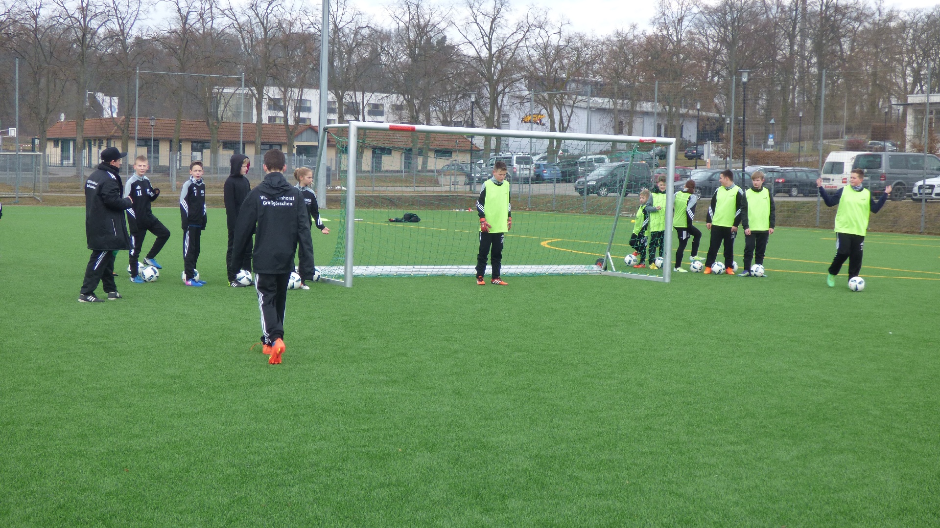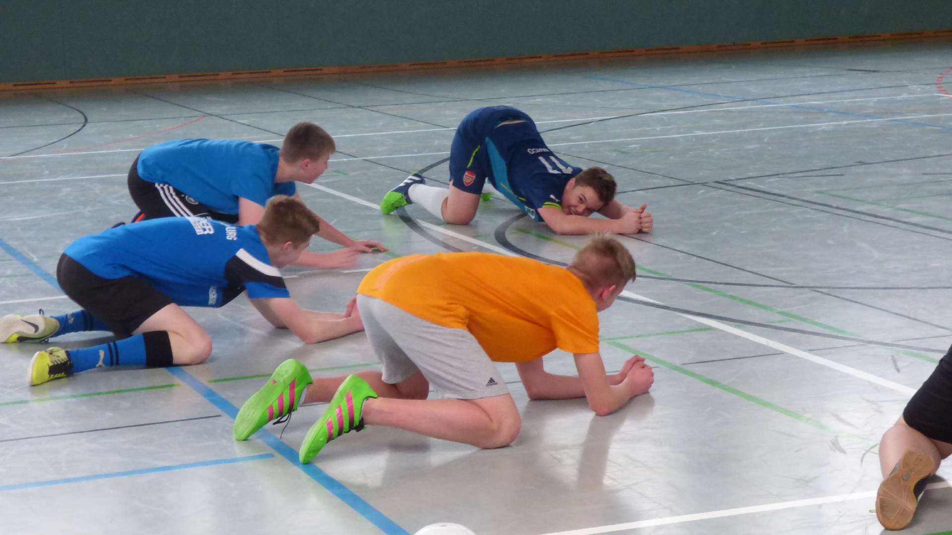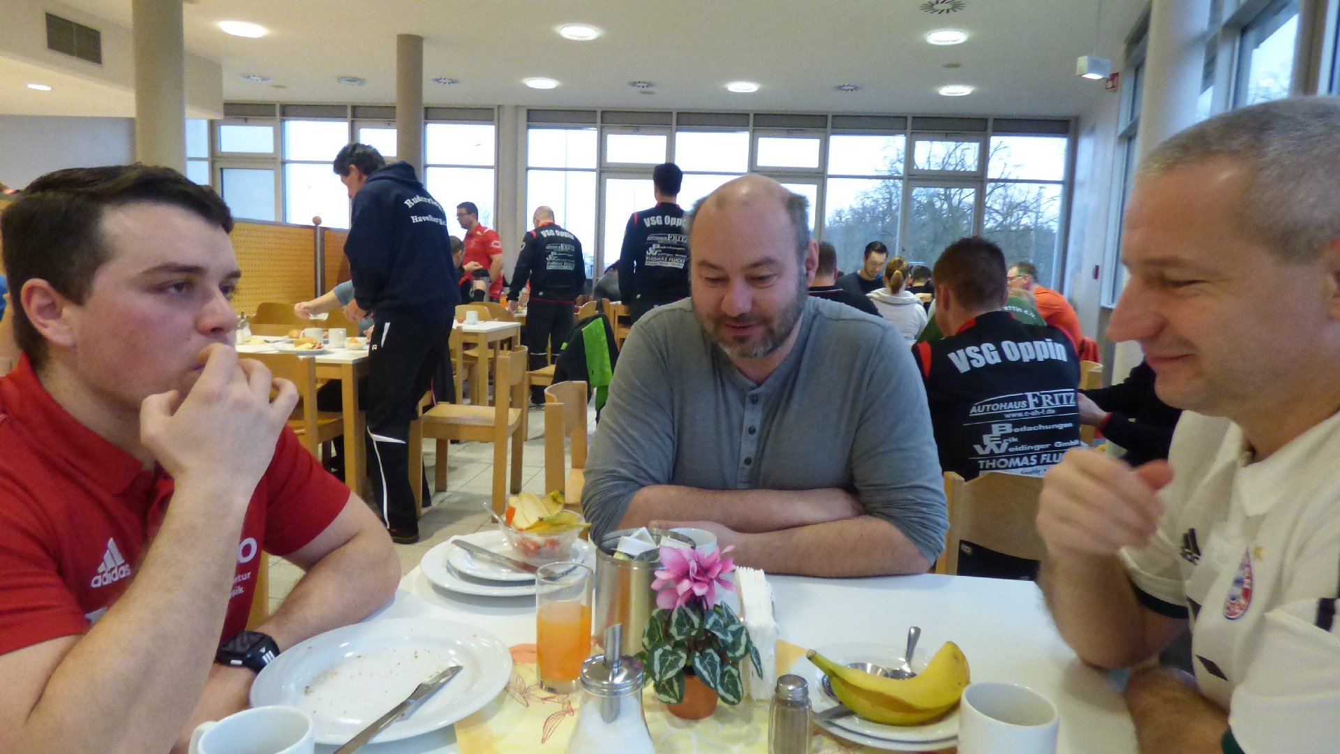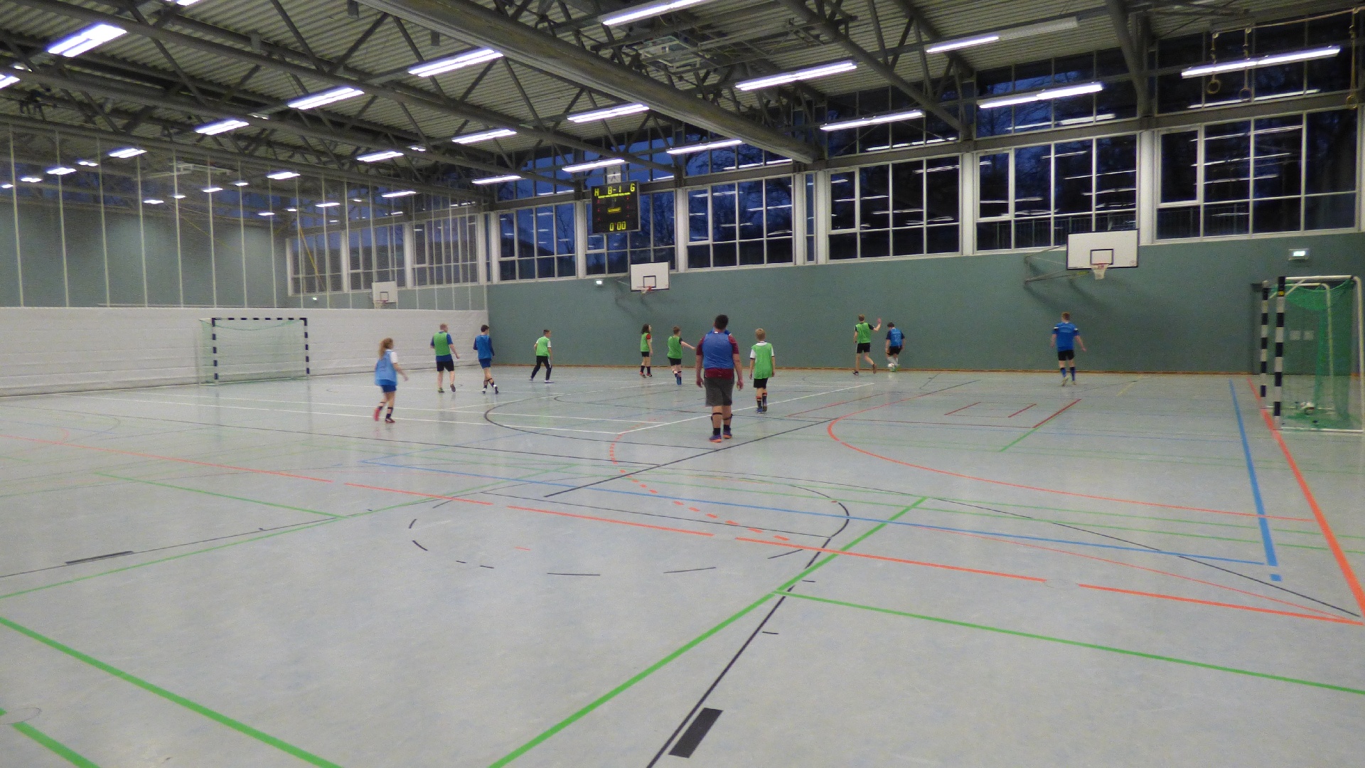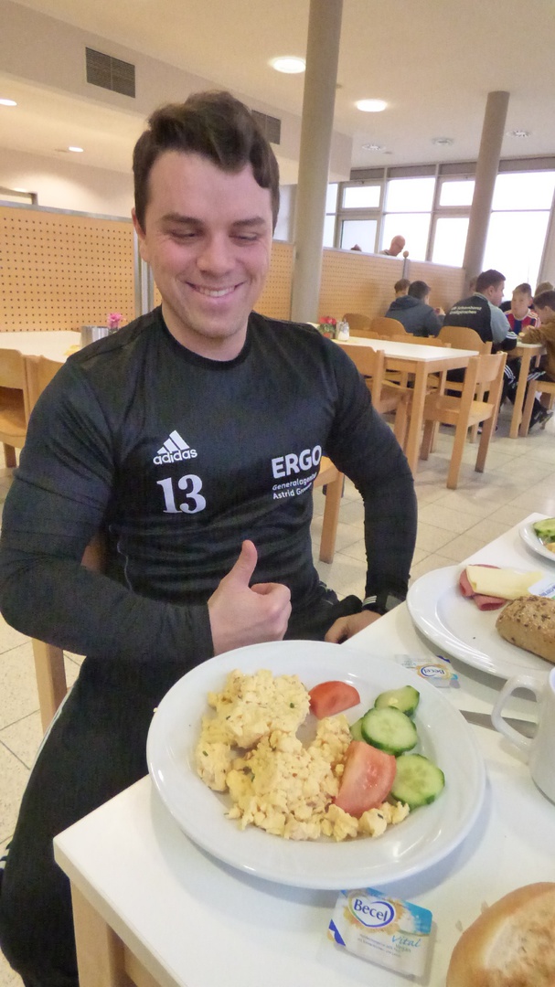Für 7:00 Uhr war das Aufstehen angesetzt, damit wir gemeinsam 7:30 beim Frühstück sitzen konnten. 9:00 Uhr begann das 2,5-stündige Hallen-Training. Die Zeit verging wie im Fluge. Vor dem Mittagessen wurde kurz oder auch etwas länger geduscht und anschließend das Nudelbuffet geplündert. 13:30 stand dann eine 2-stündige Einheit auf dem Kunstrasenplatz an. Nach einer kurzen Ruhepause begab sich die D-Jugend wieder in die Turnhalle und die B-Jugend blieb noch länger auf dem Kunstrasenplatz. Jetzt zeigten sich bei einigen Spielern die ersten Müdigkeitserscheinungen. Nach einer reichlichen Stunde merkte man dann allen die Erschöpfung an. Deshalb haben die Trainer entschieden, die jeweiligen Trainingseinheiten unabhängig voneinander etwas früher zu beenden. Und das war auch gut so, denn die Kräfte sollten ja noch für eine abschließende Trainingseinheit nach dem Abendessen reichen. Als letzter Programmpunkt stand an diesem Samstag noch eine kleine Auflockerungsübung mit Spiel an. Das Flutlicht strahlte über den ganzen Platz. Doch nach ca. 15 Minuten machte es klack und es war dunkel. Wir hatten es verpasst rechtzeitig einen Chip nachzulegen. Es dauerte einige Minuten bis das Licht wieder nach und nach anging. So konnte das Abschlussspiel mit etwas Verspätung angepfiffen werden. Ein großer Teil konnte im Wettkampfmodus noch einmal einen Gang höher schalten und neue Kräfte mobilisieren. 21:15 Uhr war das Training für diesen Tag beendet. Die D-Jugend bereitete sich auf die Nachtruhe vor und die B-Jugend wurde um 21:45 noch einmal in die Kabine eingeladen, um den Trainingstag auszuwerten. Redselig waren die Jungs nicht. Sogar die Zunge hatte schlapp gemacht. Dafür hatten sie ein Flüssigkeitsdefizit, welches wir ausgeglichen haben. Dann war auch für die Jungs der B-Jugend Schluss.