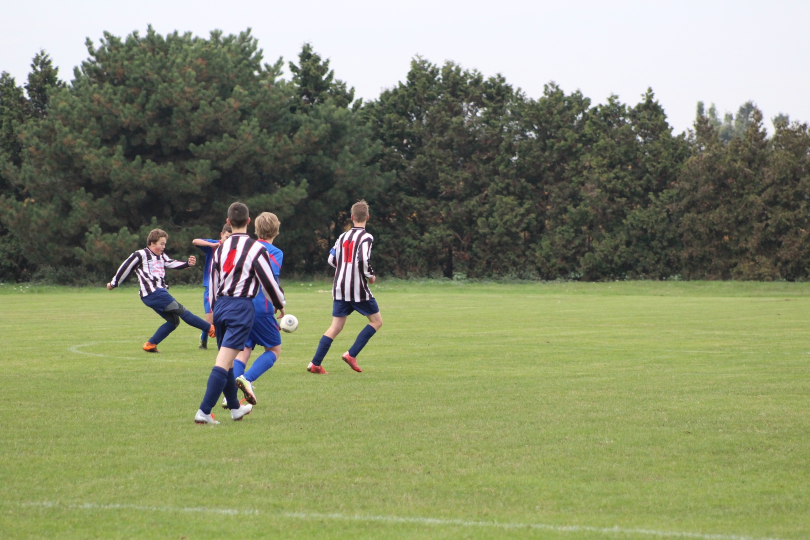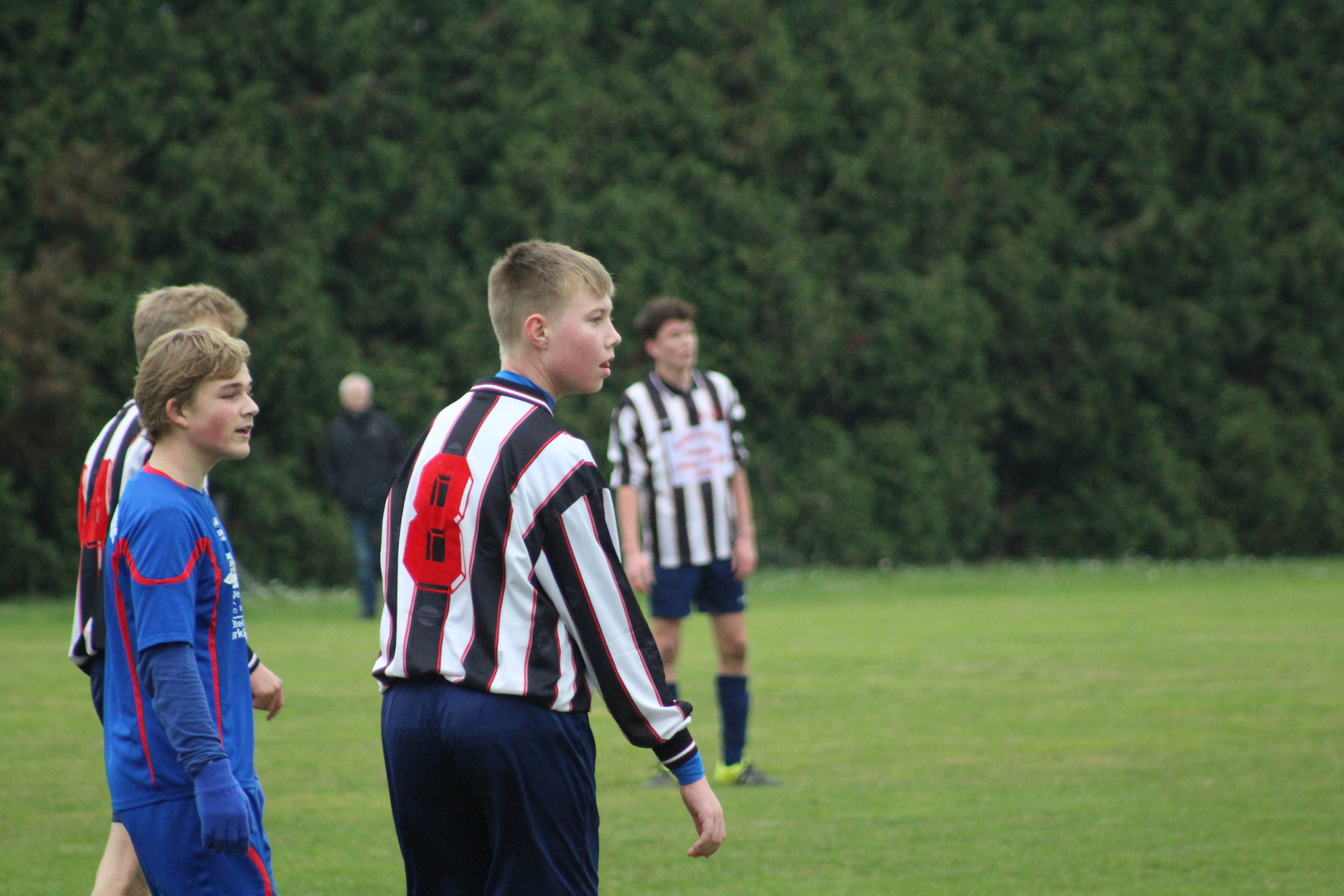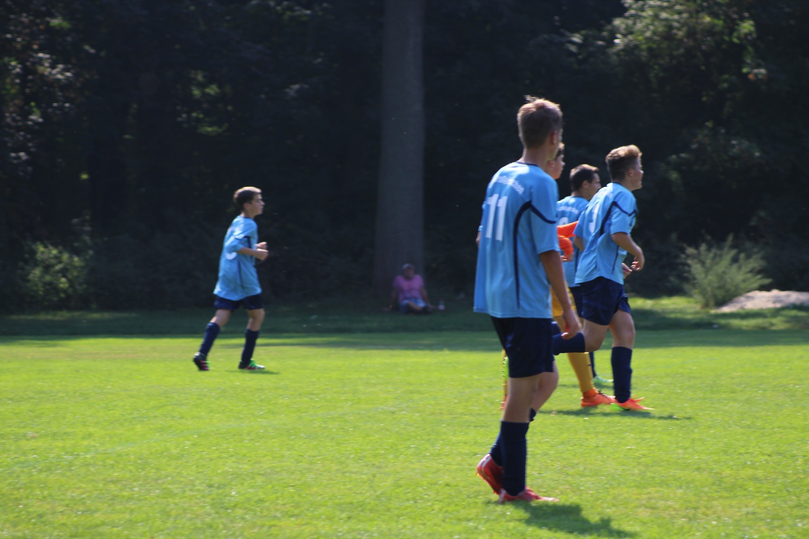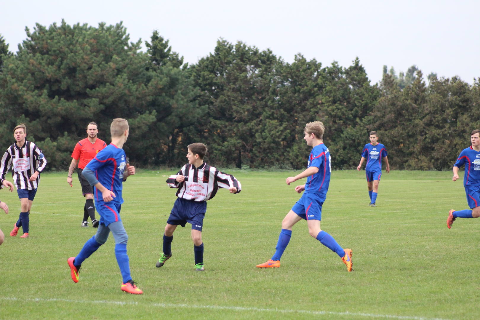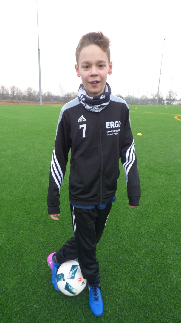Erste Halbzeit: Wir verloren die Seitenwahl und hatten damit Anstoß. Gleich zu Beginn sah ich wieder, dass die Jungs nur eine Richtung kennen. Tom wurde gleich mal die Linie lang geschickt, brachte den Ball mustergültig in die Mitte, wo er in Darco einen Abnehmer fand. Darco schaute kurz und hämmerte den Ball aus 10 m ins Tor. Alle feierten das Tor außer Tom der immer noch an der Grundlinie nach Luft rang. Er sagte auf dem Rückweg zu mir: „Ich bin kaputt und kann nicht mehr!“ Meine Antwort: „Nicht so schlimm, es sind nur noch 78 Minuten“. Ja das sind die Nachwirkungen vom Discobesuch. Die Gäste hatten nach Ihrem Anstoß nicht lange den Ball. Moritz heute mal als defensiver 6er eingesetzt, erobertet den Ball an unserem 16er. Vor Ihm war Platz und er trat sofort an Richtung Tor. Kurioserweise wurde er nicht angegriffen. So lief er mit dem Ball am Fuß im Zick-Zack bis in den gegnerischen Strafraum und wurde dort regelwidrig zu Fall gebracht. Er nahm sich die Pille gleich selber und verwandelte sicher. Das Spiel fand überwiegend in der gegnerischen Hälfte statt. Kevin und Tom waren auf den Außen immer anspielbar. Lennart und Darco machten die Bälle im Zentrum fest. Kevin zog es in der 20 Minute auf die linke Seite und er brachte den Ball mustergültig zu Darco in die Mitte. Dieser legte ab auf Lennart, der den Ball aus 18 Metern in die Maschen schlug. Die Gäste standen jetzt hinten etwas dichter und warteten auf Konter. Kevin versuchte es jetzt durch die Mitte und spielte Alex an, der für Ihn auf den rechten Flügel ausgewichen ist. Alex setzte sich gegen 2 Abwehrspieler durch und schob aus spitzen Winkel zum 4:0 ein. Die Gangart der Gäste wurde nun etwas härter. Alex trat den Freistoß, ca. 30m vorm Tor auf das lange Eck. Moritz lief ein. Nahm den Ball gekonnt mit und schoss ins lange Eck. Mit der 5:0 Führung ging es in die Pause.
