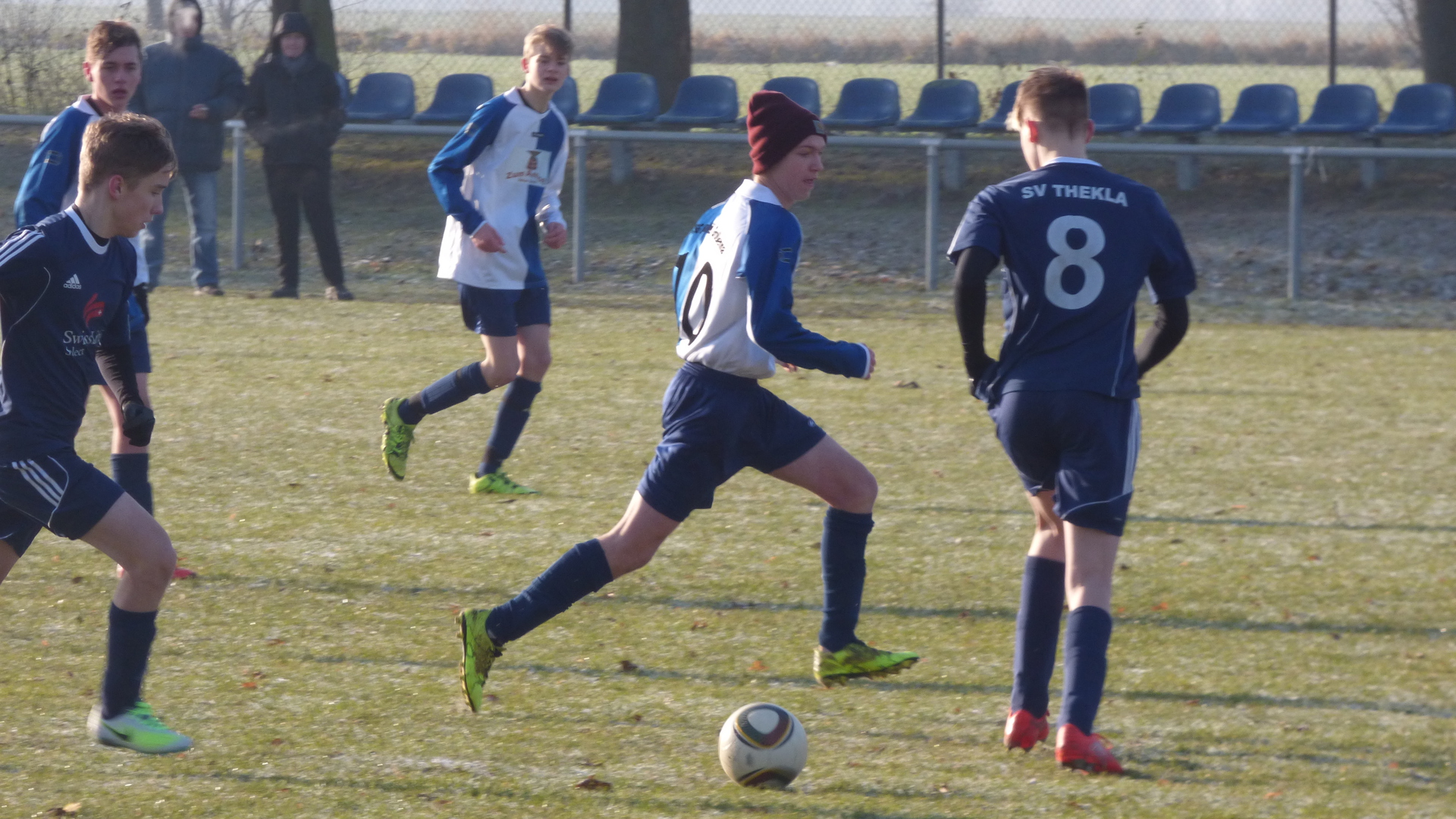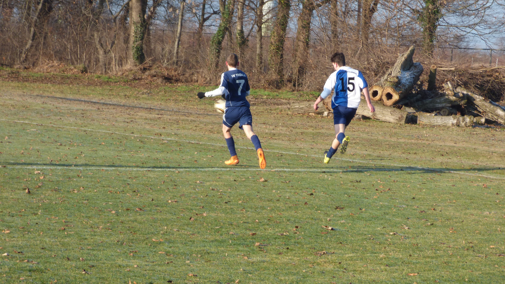 Erste Halbzeit: Diesmal sollte die Kabinenansprache etwas anders ausfallen. Viele beruhigende Worte, nicht auf das körperbetonte Spiel einlassen, wir antworten heute mit Spielwitz, nicht so viele lange Dribblings, nicht Reizen lassen, kurz gesagt … wir wollten in diesem letzten Spiel noch einmal richtig Spaß haben. Nach unserem Anstoß hatten wir aber nicht lange den Ball. Sofort kam der Gegner über unsere linke Seite. Anstatt den Ball kontrolliert ins Seitenaus zu spielen, wollten wir den Ball schnellstmöglich zurückerobern! Großer Fehler! Zum Glück sprang der Ball von unserem Pfosten wieder in das Spielfeld zurück. Der folgende Abstoß landet genau bei Tom. Er lässt den Ball etwas weit verspringen und ein Theklaer Spieler spielt den Ball ins Aus. Diese Situation spielte sich genau zwischen den Trainerbänken ab. Tom geht zum Einwurf und der gegnerische Trainer ruft „Wir werfen!!“. Der Schiri ließ sich durch den lautstarken und konsequenten Zwischenruf beeinflussen und entschied auf Einwurf für Thekla. Wir haben dem Theklaer Trainer gleich gesagt, dass er ein sehr unsportliches Verhalten an den Tag legt. Schon waren die Gemüter in den ersten Minuten erhitzt. Die erste Viertelstunde waren die Gastgeber spielbestimmend, jedoch ohne weitere Torchance. Im weiteren Verlauf kamen wir immer besser in das Spiel. Thekla hatte Abstoß, dieser landete genau bei Darco. Er nahm den Ball gekonnt mit und schoss von der Strafraumgrenze, knapp links am Tor vorbei. Wenige Minuten später setzt sich Kevin über Außen durch und legte den Ball in die Mitte zu Darco ab. Darco traf leider nur die Latte und nicht das leere Tor. Wir erarbeiteten uns nach nach mehr Spielanteile und auch Torchancen. Kurz vor der Halbzeitpause startet Jojo von der eigenen Strafraumgrenze ein Solo und holte sogar einen Eckball heraus. Es war schön anzusehen, wie er einen nach dem Anderen aussteigen ließ. Er stellte sehr geschickt den Körper zwischen Ball und Gegner und zeigte damit, dass auch wir körperbetont Fußball spielen können. Allerdings mit fairen Mitteln. Mit diesem Solo hat er endgültig seinen Spitznamen weg ... „Der blonde Büffel“.